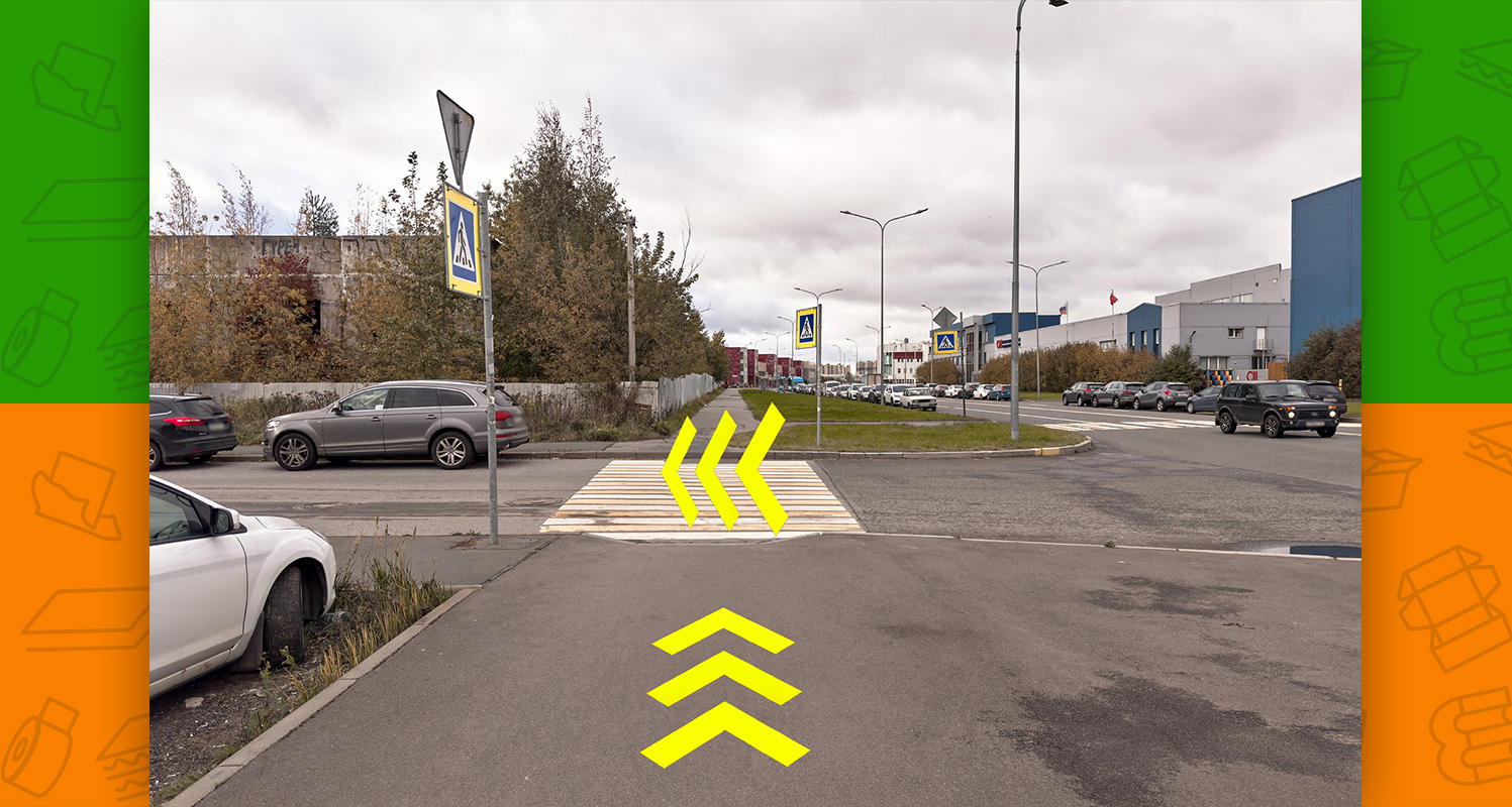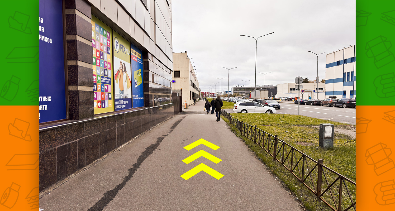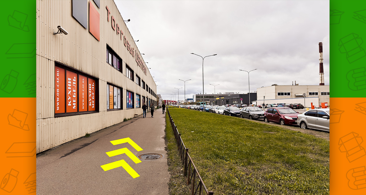 - по Мебельной улице пройти 350 метров по левой стороне, мимо зданий: